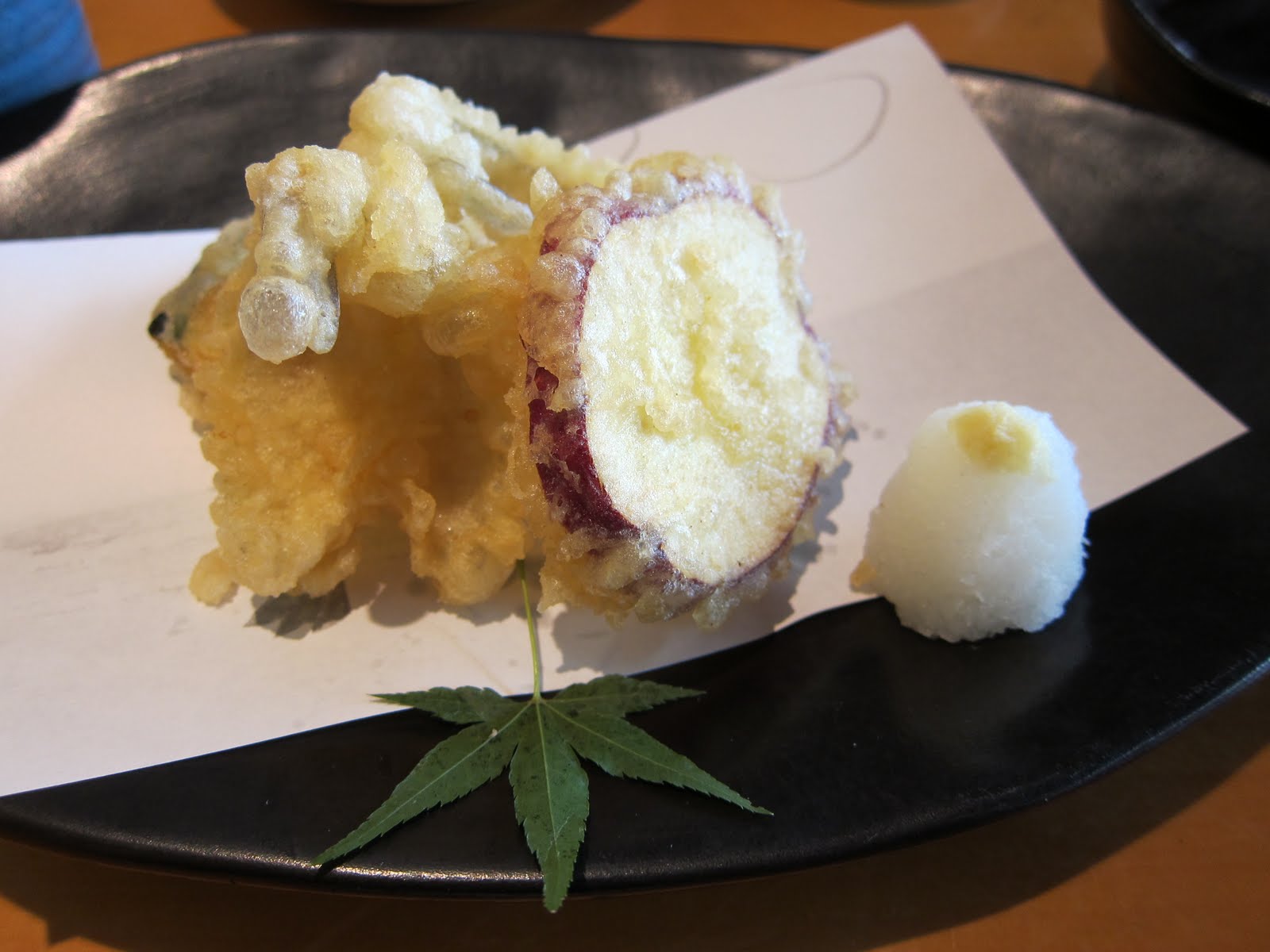 The fried item was an assortment of tempura, including white fish (overdone), pumpkin sweet potato and eggplant which were decent. Nice touch on the hot tempura dip though.
