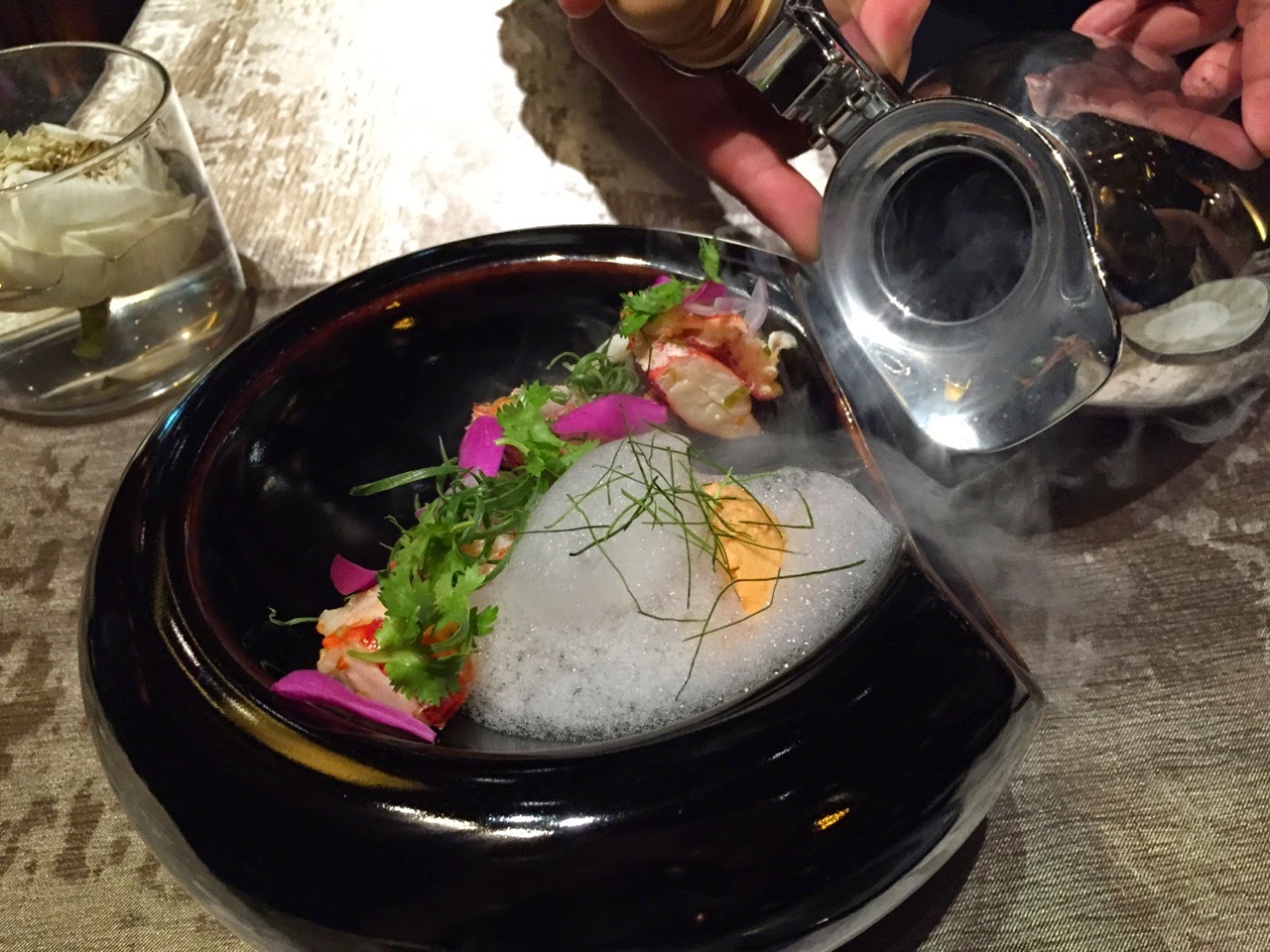 The picture above is when they were just about to pour liquid nitrogen into the mouth of the bowl for that smoke effect. I was too focused on capturing a great video I forgot the quality of the photo - sorry! Photos aside this dish was pretty damn perfect. A small scoop of the frozen red curry sauce is hidden - very coconut-ty and generous on the spice to make you need the rambutans, almonds, herbs and perfectly juicy sweet poached lobster for balance. My friend declared this her favourite dish before she even tried ones to come.